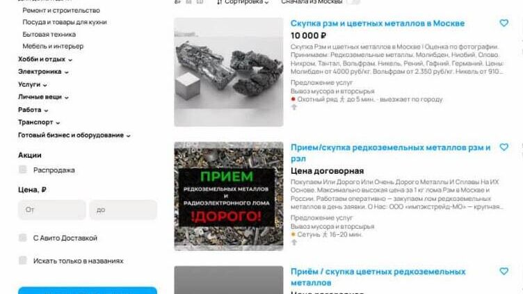 С ростом спроса на высокотехнологичные устройства и зеленую энергетику, объявления о скупке лома редкоземельных металлов в Москве стали активно появляться на различных онлайн-платформах, установили журналисты РИА Новости.