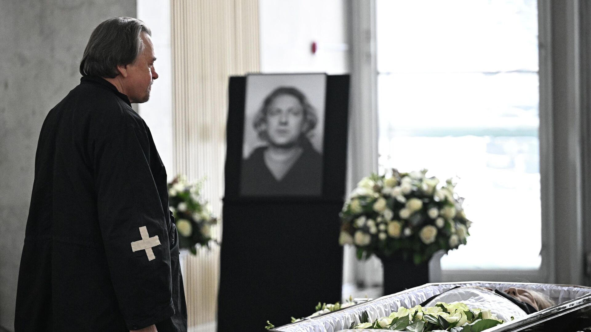 Пришедшие несут цветы к Большому залу Троекуровского кладбища, чтобы проводить режиссера в последний путь.