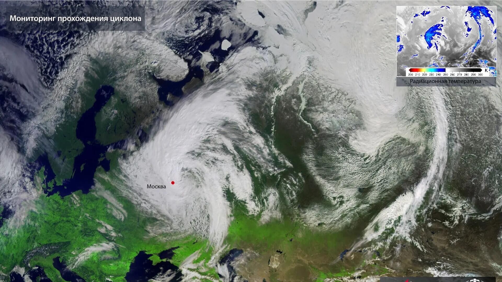 На изображении видна Москва под влиянием циклона, европейская часть России и фрагмент азиатской, почти вся Европа (кроме самых западных стран), Черное и Средиземное моря, Турция, Север Африки, а также части Ближнего Востока и Центральной Азии.