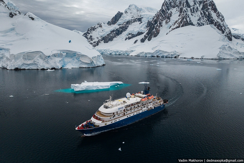 Как отмечает Махоров, судно успешно преодолело пролив Лемер, который является одним из самых популярных мест для туристов в Антарктике. Это уникальное место характеризуется отвесными скалами, покрытыми ледяными шапками, которые возникли после таяния мощных ледников. Фотограф опубликовал несколько снимков, сделанных с помощью квадрокоптера, на которых видно, как большое судно проходит через пролив, окруженный обледеневшими скалами.