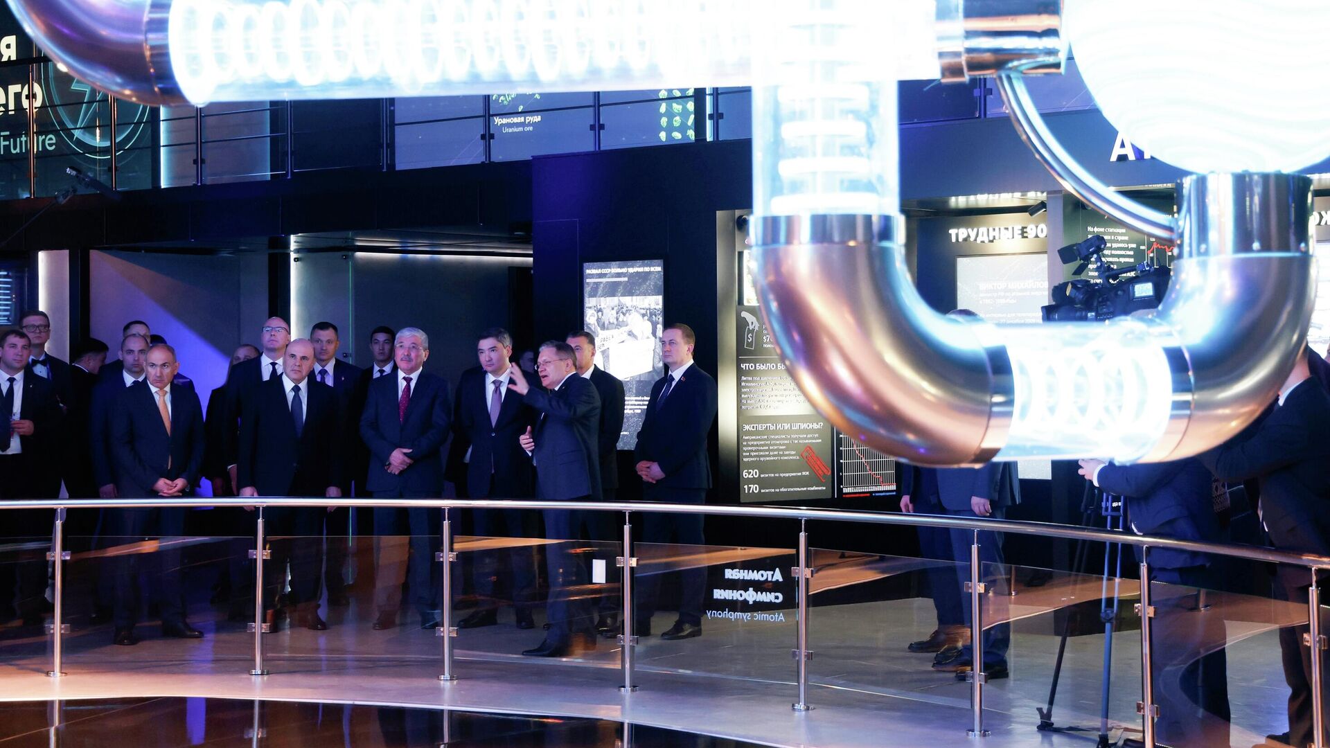 Глава "Росатома" Алексей Лихачев провел для премьер-министра России Михаила Мишустина и руководителей правительств стран СНГ экскурсию по выставке "Советский атомный проект" в музее "Атом" на ВДНХ.