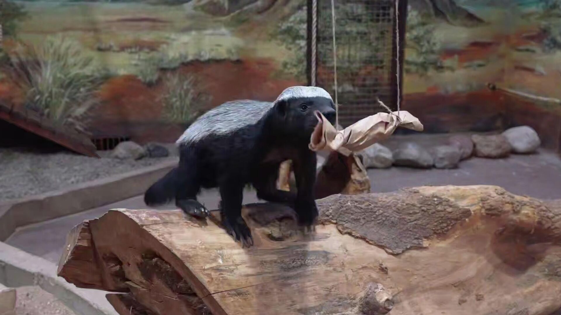 На опубликованном видео видно, как Нео пытается лапами достать бумажную «конфету», висящую на тросе, но не может дотянуться. Тогда он забирается на бревно, с которого уже легко захватывает подарок, разрывает упаковку зубами и достает кусочек мяса. Затем медоед переходит к мешку с сеном, разрывает его и наслаждается найденным угощением.