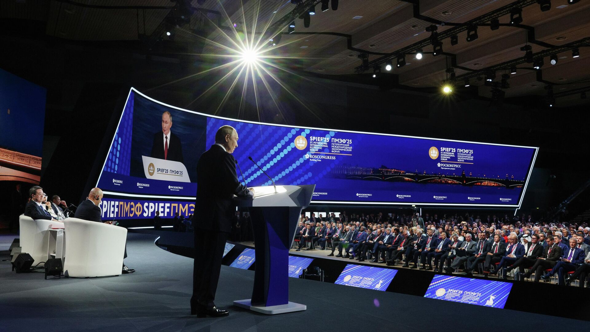 Кроме российского лидера, в главной сессии форума участвовали президент Индонезии Прабово Субианто, сын короля Бахрейна Насер Бен Хамад Аль Халифа, заместитель премьера Госсовета Китая Дин Сюэсян и вице-президент Южной Африки Пол Машатиле. Модератором пленарной сессии был генеральный директор телеканала Sky News Arabia Надим Кутейш. Петербургский международный экономический форум проходил с 18 по 21 июня, а его главная тема в 2025 году была "Общие ценности - основа роста в многополярном мире". РИА Новости выступает информационным партнером форума.