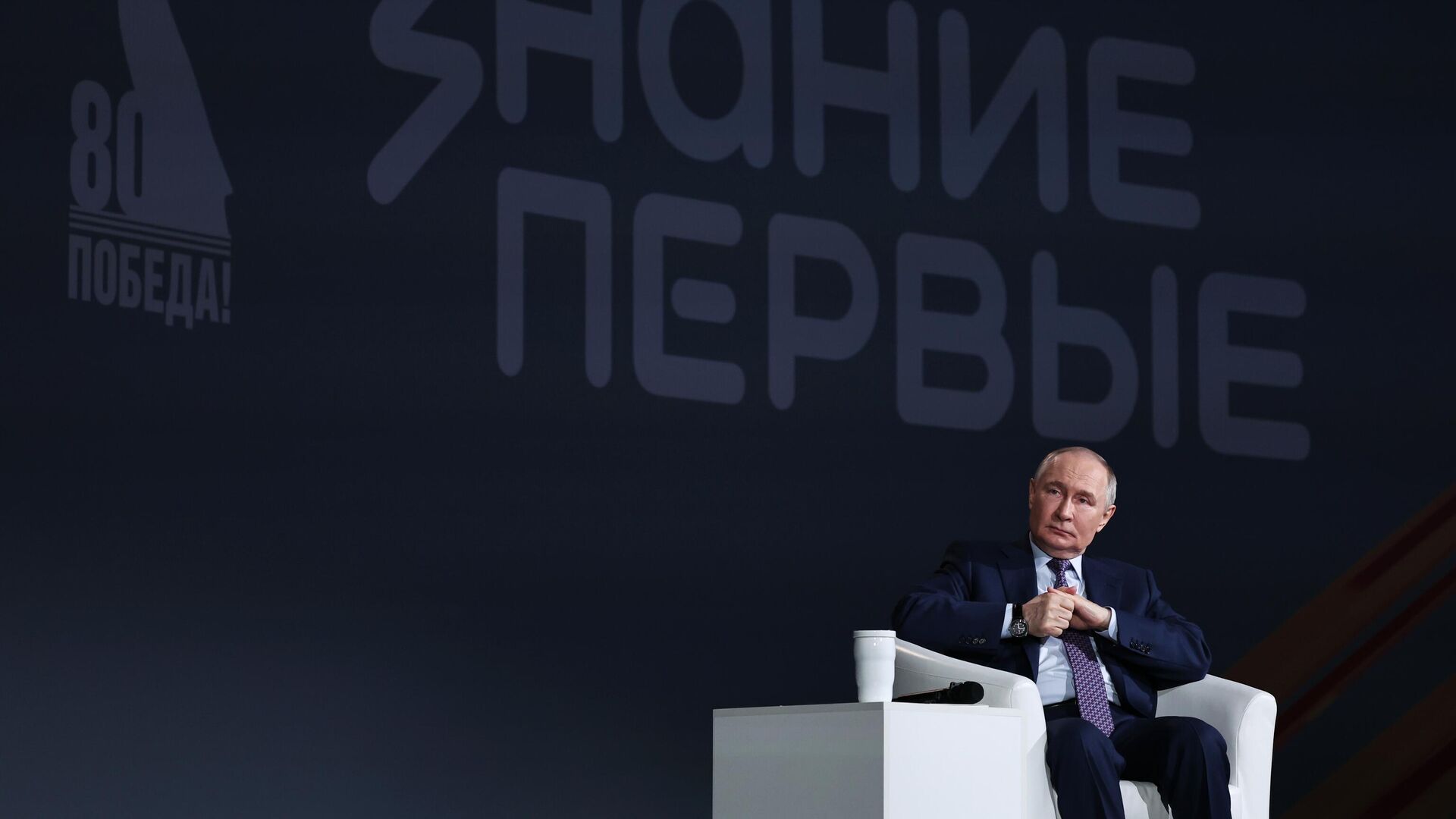 Президент России Владимир Путин поздравил участников марафона "Знание" с наступающим Днем Победы во время своего выступления на федеральном просветительском марафоне "Знание.
