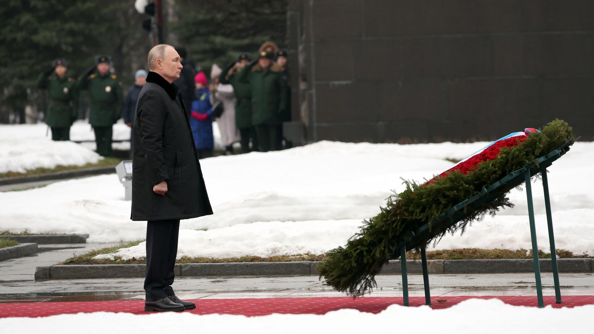 В честь годовщины снятия блокаады Ленинграда президент России Владимир Путин принял участие в мемориальных мероприятиях, появившись с лентой Ленинградской Победы на лацкане пальто, сообщает корреспондент РИА Новости.