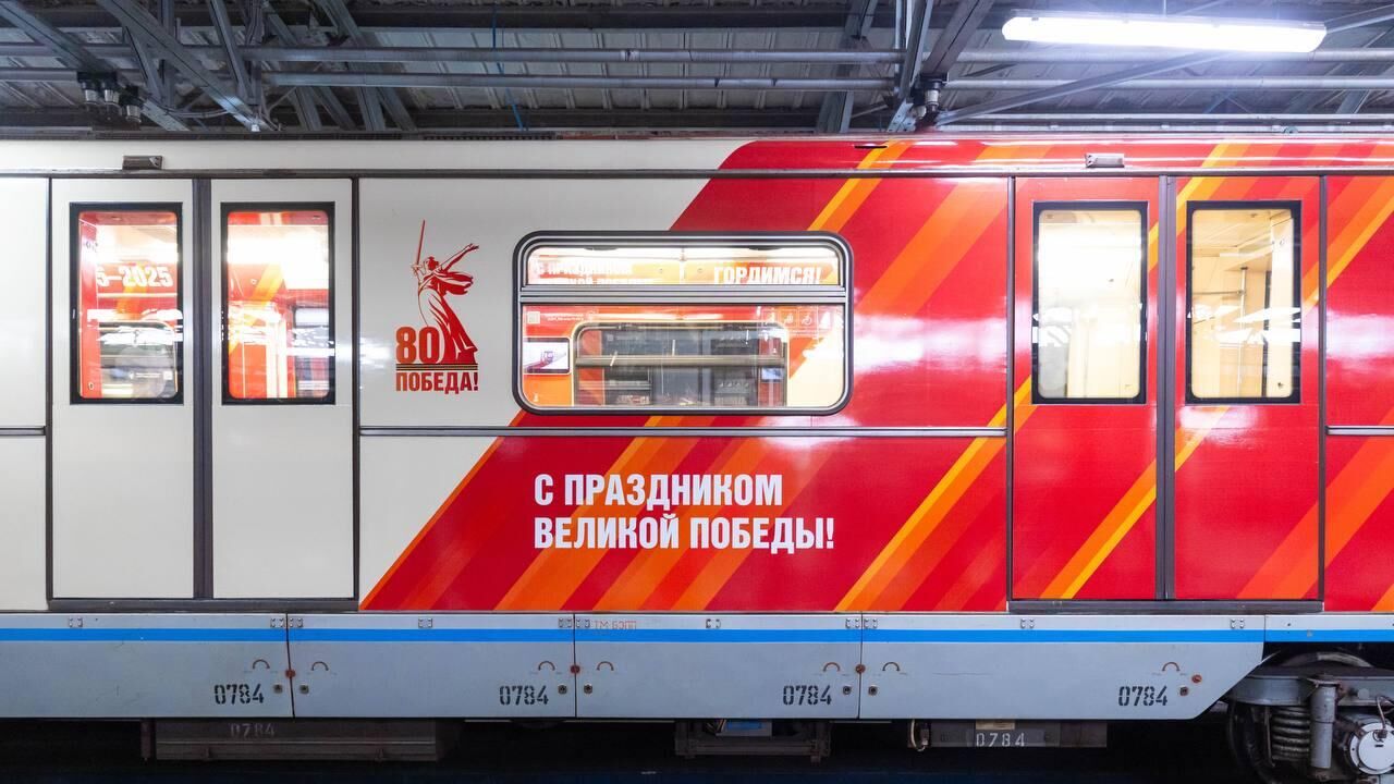 По традиции городской транспорт украшается в честь главных государственных праздников по поручению мэра Сергея Собянина. В этом году тематический поезд, оформленный в красно-бежевых тонах, будет курсировать по линии до конца июня. На надписях в каждом вагоне написано: "С праздником Великой Победы!" и "80 Победа!".