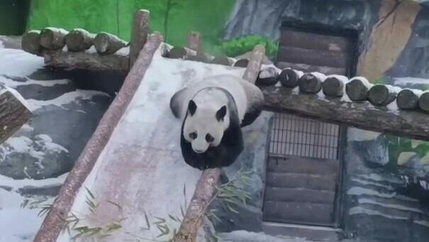 На опубликованном видео мама-панда с детским восторгом играет в снегу: она скатывается с горки и бегает с мячиком, разрезая снежный покров.