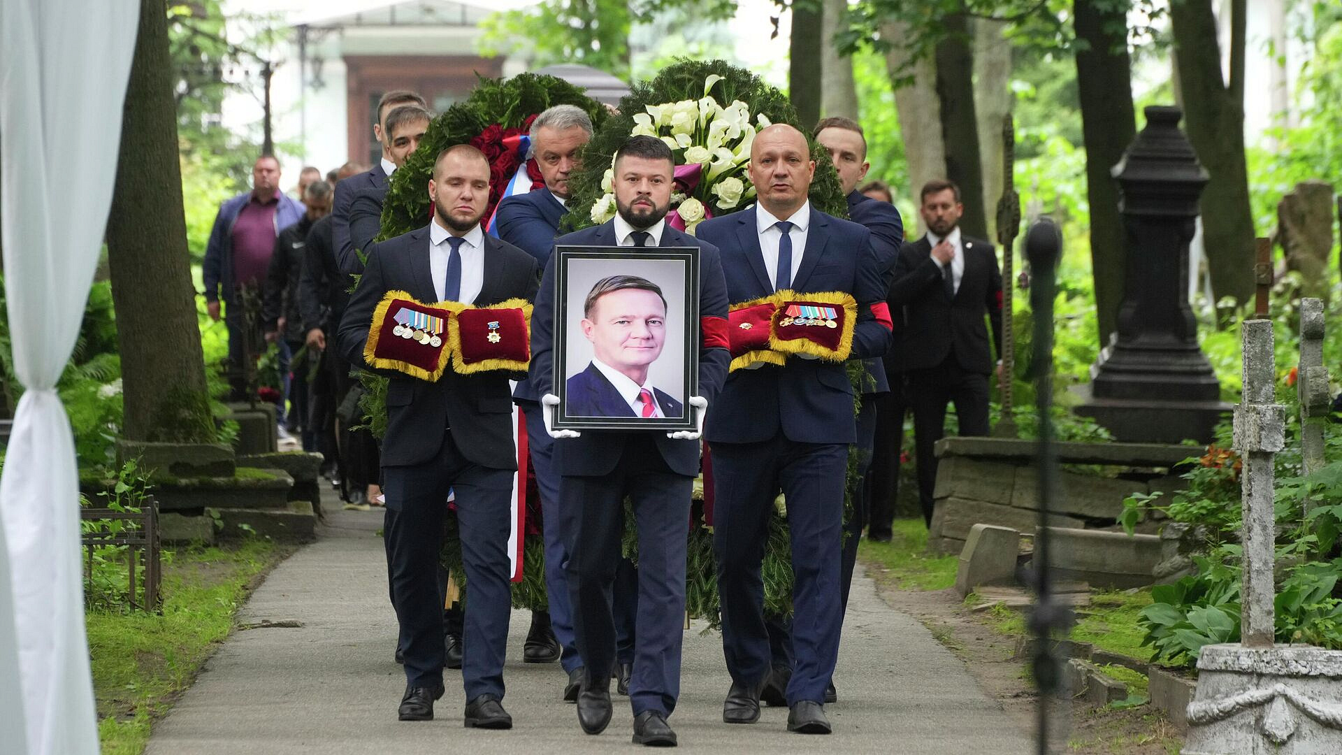 Экс-министра транспорта РФ Романа Старовойта проводили на последний путь на Смоленском кладбище в Санкт-Петербурге.