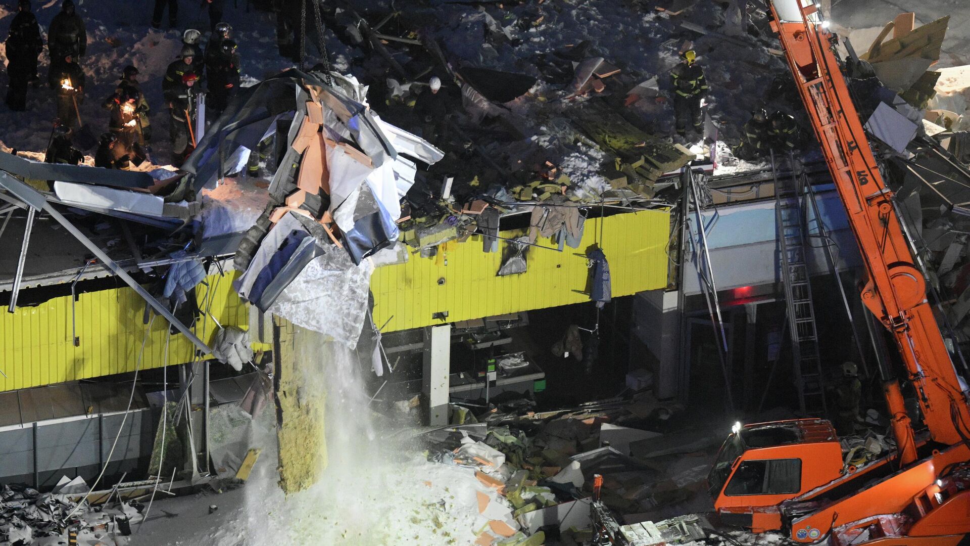 Обрушение конструкции крыши площадью 600 квадратных метров и второго этажа двухэтажного здания торгового центра произошло на улице Наумова в Новосибирске. Ранее сообщалось о двух пострадавших и еще двоих, которых спасатели извлекли из-под завалов и передали медикам. Спасатели соблюдают минуту молчания.