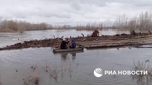 В селе Темляково в Курганской области спасатели извлекли из реки Тобол деревянный мост, который был снесен водой из-за резкого подъема уровня воды.