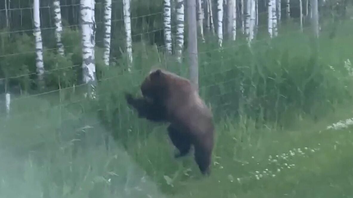 В Ленинградской области сотрудники ДПС сопровождали медведя, который случайно вышел на дорогу и пытался уйти в лес через дыру в ограждении.