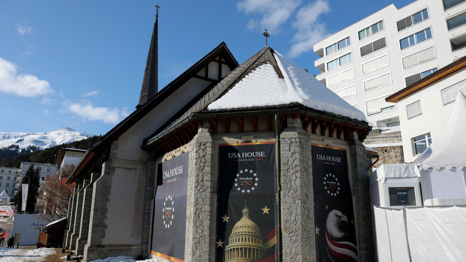 Традиционно страны и международные корпорации арендуют фасады зданий на центральных улицах швейцарского курорта. Однако американский павильон выделяется: США заняли историческое здание Английской церкви.