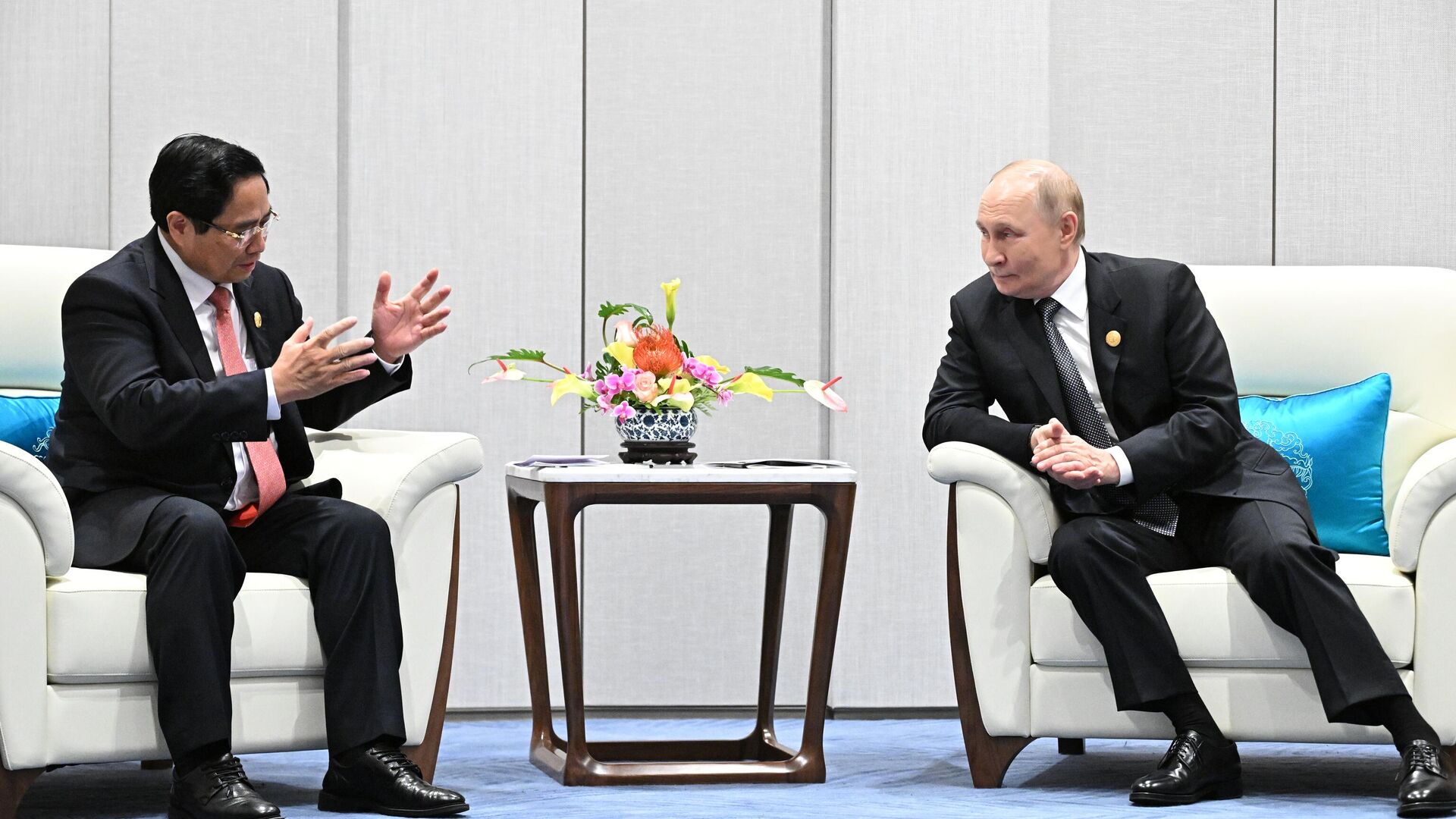 Встретившись с премьер-министром Вьетнама Фам Минь Тинем на полях саммита Шанхайской организации сотрудничества (ШОС) в Тяньцзине, Путин подчеркнул, что экономические отношения между двумя странами активно развиваются. Оба лидера выразили готовность продолжить контакты и обсудить вопросы сотрудничества в ближайшие дни в Пекине в рамках праздничных мероприятий по случаю окончания Второй мировой войны.