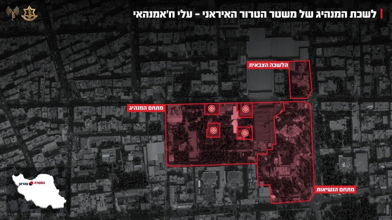К заявлению прилагается снимок с воздуха, на котором отмечен комплекс зданий в Тегеране, где находился Хаменеи в момент удара.