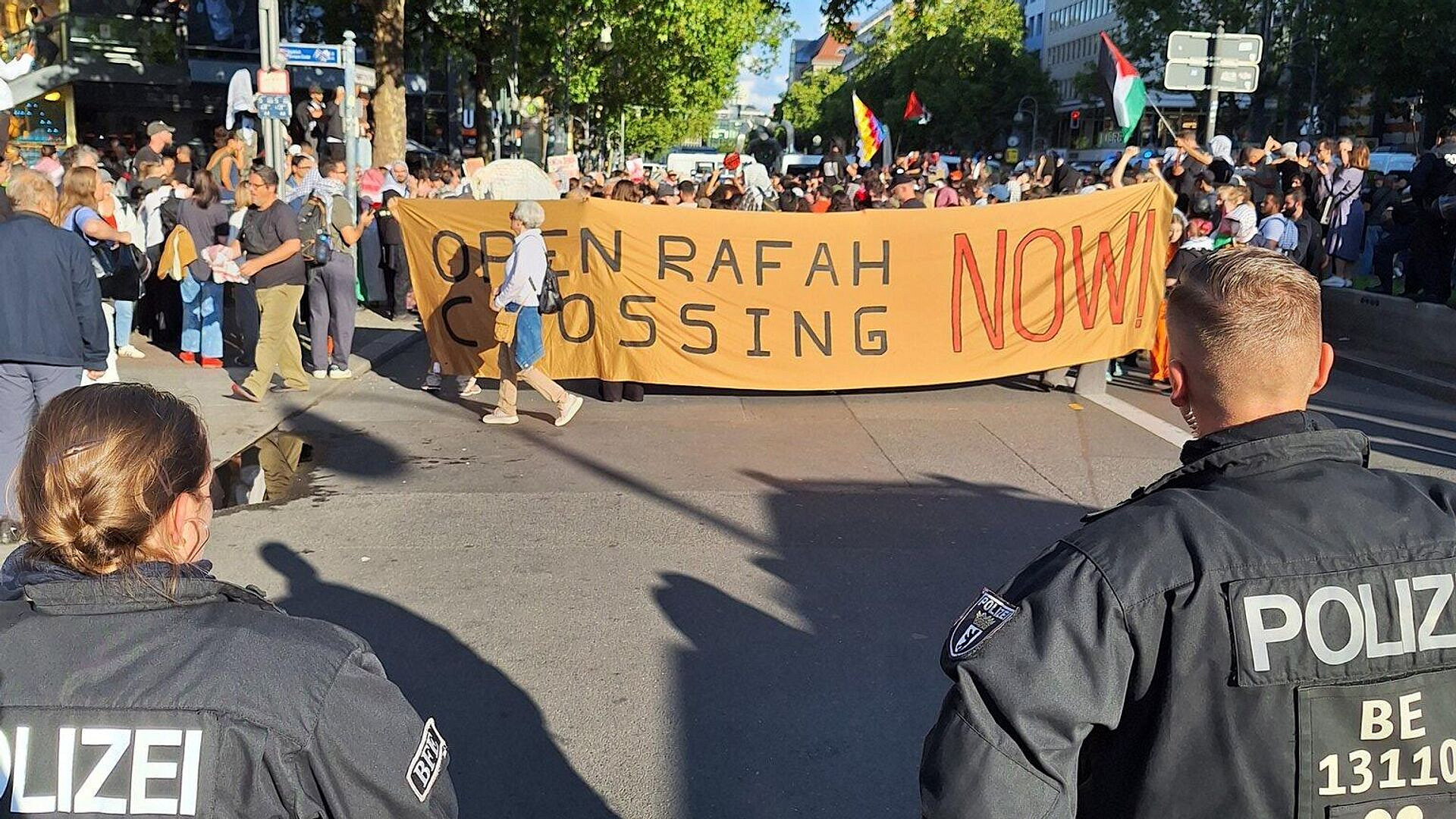 Участники движения Querdenker несли знамена с символом мира, а также флаги Германии и Палестины. По информации Berliner Morgenpost, параллельно проходила контрдемонстрация, в которой участвовали около 600 человек, однако столкновения удалось избежать.