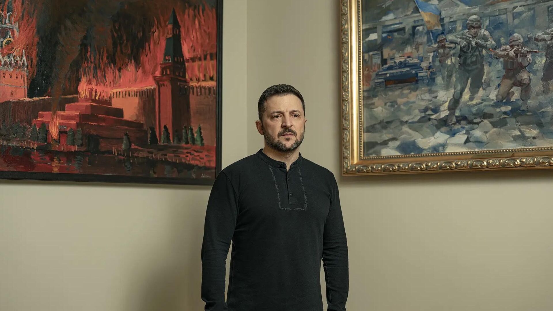 В своем интервью для журнала Time Владимир Зеленский оказался на фоне картины с изображением горящего Кремля и мавзолея.